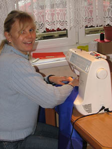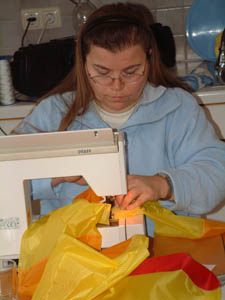 | Aus vielen Teilen werden Streifen genäht,.. | Drei Nähmaschinen rattern im Takt,... |